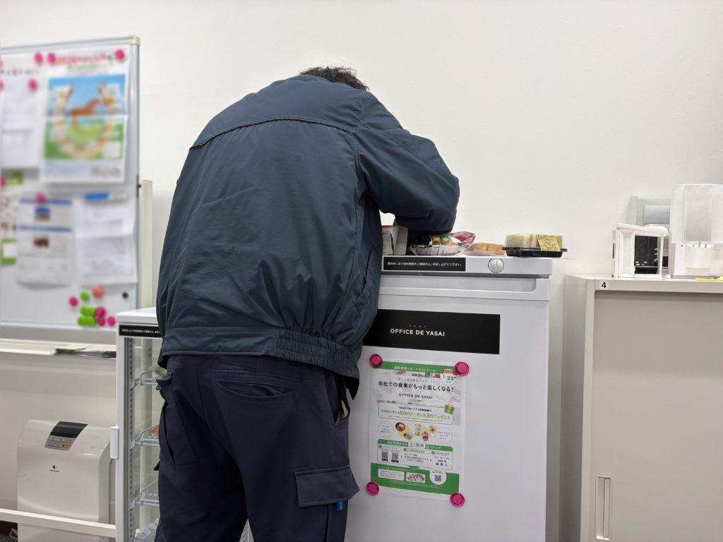 社員食堂…ではなく、設置型の社食なので好きなときに好きなだけ買うことができちゃいます!事務スタッフはもちろん、現場スタッフも外回りの前に買ったり、帰社後に買ったりと、すでに楽しそうに購入している様子が見られます!